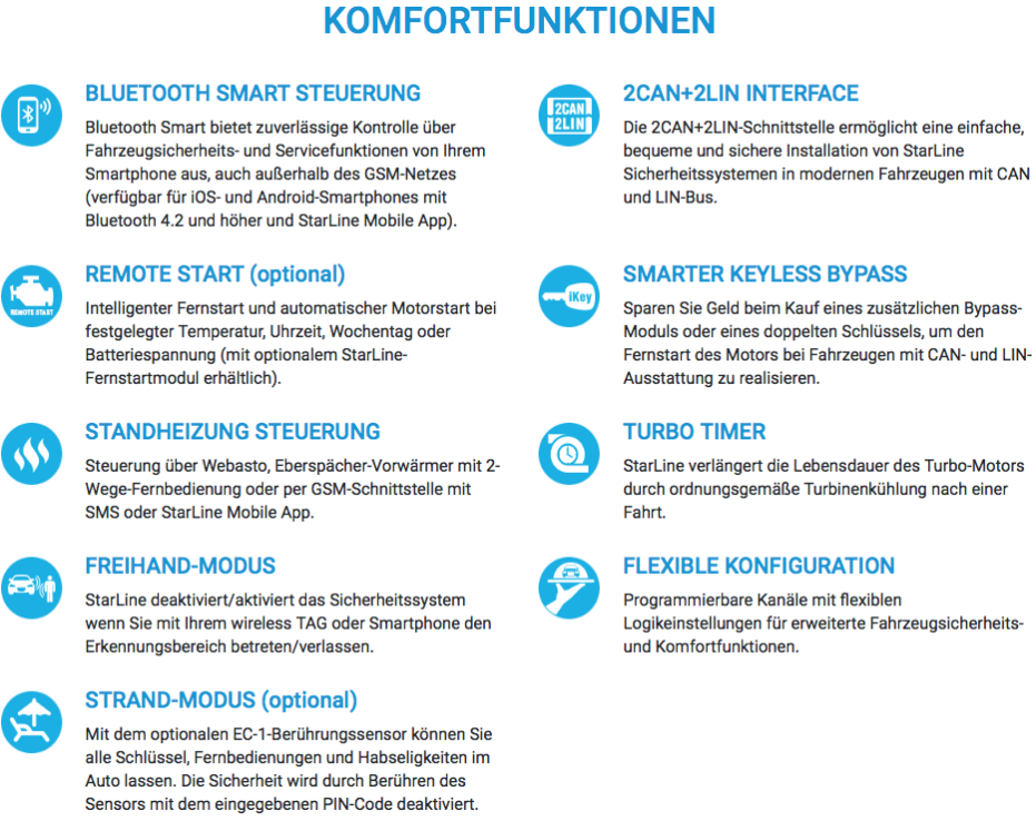 Nicht alle Funktionen die die StarLine Alarmanlage bietet, wird von jedem Fahrzeugtypen unterstützt!